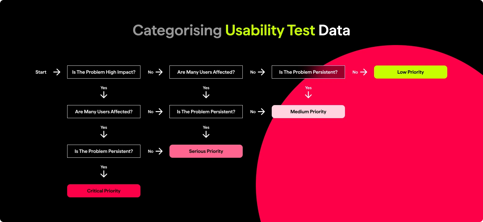 Once usability testing has been done, you can go back and analyse the data you found, what worked best and how many participants completed the task.You also can detail any problems that were found, such as ‘Is the problem of high impact?’, ‘Are many users affected?’ and ‘Is the problem persistent?’, and categorise these into Critical, Serious, Medium, or Low improvements or changes that need being made.