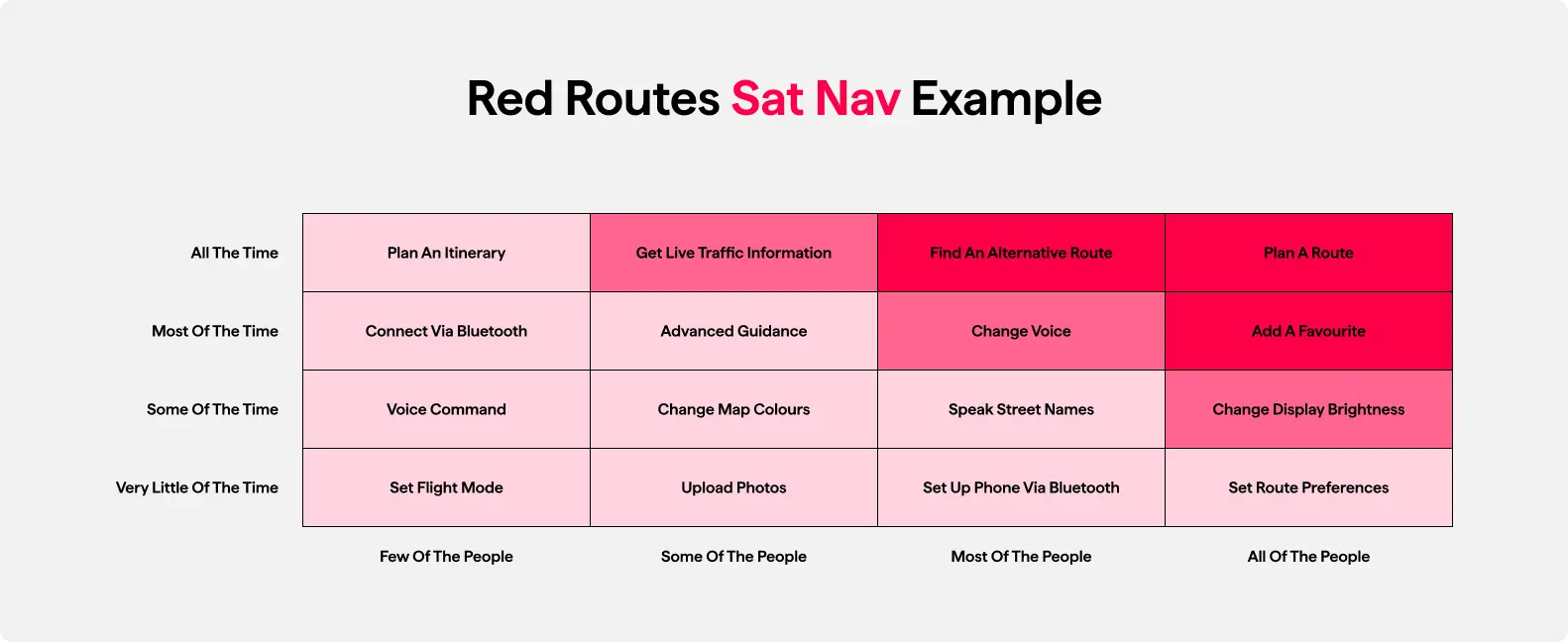 Red routes are the key user journeys that bring the most value. Every site or product has a handful of tasks that users absolutely must be able to complete quickly and without friction. Prioritising these routes keeps the design focused and prevents the experience from getting cluttered with secondary features that distract from what really matters.